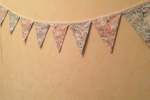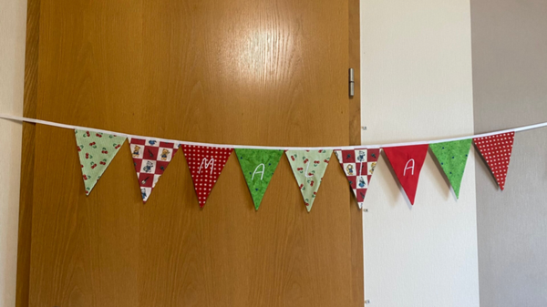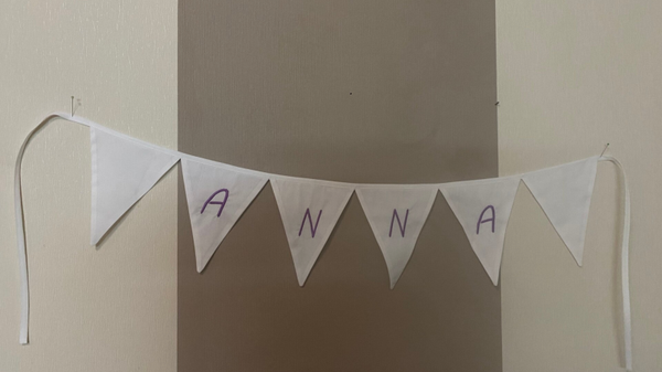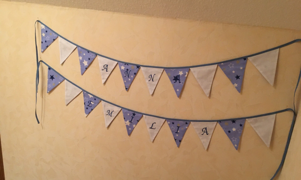 Personalisierte Wimpelkette aus Baumwolle mit Namen bestickt.